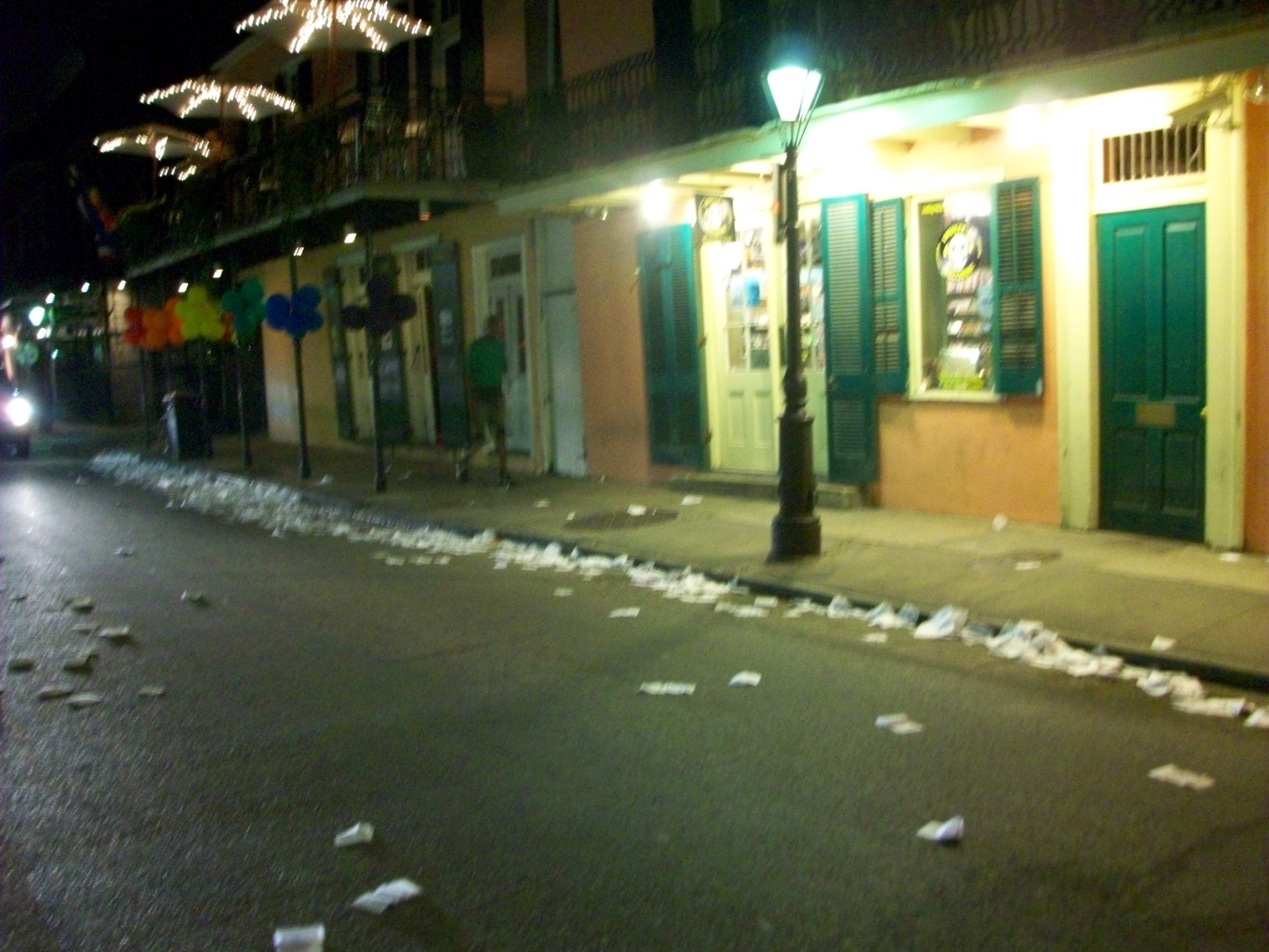 I expect to see this sort of scene on Bourbon Street. I visited Las Vegas once, and this strip reminds me of there. Except in Las Vegas, they go to great lengths to make it seem like you are outside even when you are inside: ceilings painted with clouds, lighting dimming like a sunset at regular intervals, canals running through the building. Bourbon tries the opposite–it makes you feel like you are inside–or better, inside a place that is trying to make you feel like you are outside. But with terrible air conditioning. At the end of Bourbon tonight, though, past St. Ann’s, I saw this scene that I actually wasn’t expecting: a veritable ticker tape parade of napkins. I wonder what went on here. I know how the streets get wet with booze and vomit. Perhaps this stretch of Bourbon is trying to clean it up. I tooled to the end of the street, over to Frenchman, and then stopped for my own bourbon on Decatur. I, like everybody else up past my former bedtime, enjoyed taking in the sights.