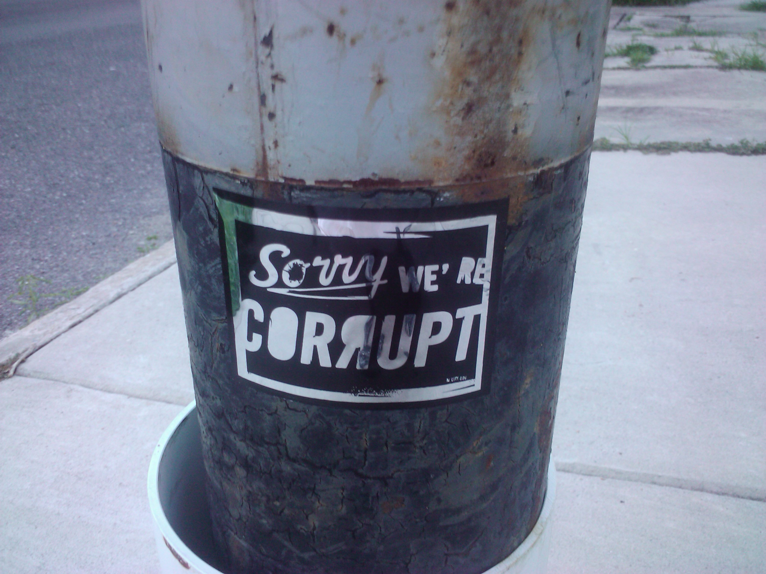 “Sorry We’re Corrupt” Sticker at Magazine and St. Andrew