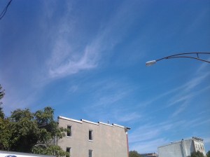 Tuesday was another busy day for me, so I didn’t have time for a long bike ride. In fact, I didn’t feel like I had time for a bike ride at all. But I wanted to sneak in a trip to the gym, and I’m certainly not going to drive a car three piddly miles, so I hopped on the bike and sped down the hill for a quick turn and a ride back up the hill. I know I’ve been on about the weather shift for awhile, but the skies are really incredible. I was in a hurry–my least favorite place to be–but as soon I was on my bike that hurried sense started to fade as I paid attention elsewhere. That’s one part of riding a bike that I like so much–you have to pay attention to the outside of your home, your office, your head, because if you don’t, you might get hit by a car or ride into a pothole or over a roofing nail blown into the street in a previous storm. I stopped at the top of Fallsway to snap this picture of the blow sky, just a little of the vacant building that’s one of many heading east, and a hint of green and stretch of the streetlight. All blue skies, but the rest is the same too. And then I was back up the hill and glad I’d gone for a spin, as per usual, and continued about my day, capping it off with Baby’s First Ride on the light rail down to see the O’s pull out another win. Light rail. I could get into that.