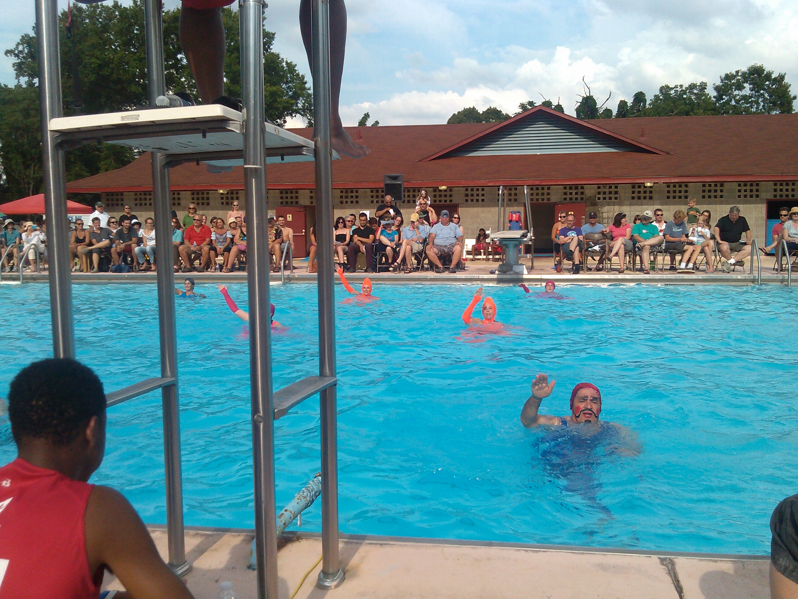 As N. and I rolled back into town from our epic journey to Rosedale, Maryland, she asked, “So, are you going to take a bike ride?” Maybe, I said, maybe not. I went ahead and took a ride–a short one–up to Druid Hill Park to check out Fluid Movement‘s water ballet inspired by Moby Dick. I took the street into the park to avoid what was sure to be a parking hassle. There were volunteers directing cars down and up a safety-coned street and others directing drivers straight up the hill. I went ahead and grabbed a parking spot right in front, smug bicyclist that I am, and got my ticket for the show. My favorite part of the show was just the fact that so many grown people would decide to devote this much time and energy to put on a water ballet. And also the youth diving team doing their show to this song. I grabbed a seat, read every single word and name in the program, and then enjoyed the conceit, the dances, the swimming, and the music. It’s just joy and that’s it, this show. A quick hour later and I was back on the bike, speeding the downhills home as the clouds rolled in. What a great weekend, eh?