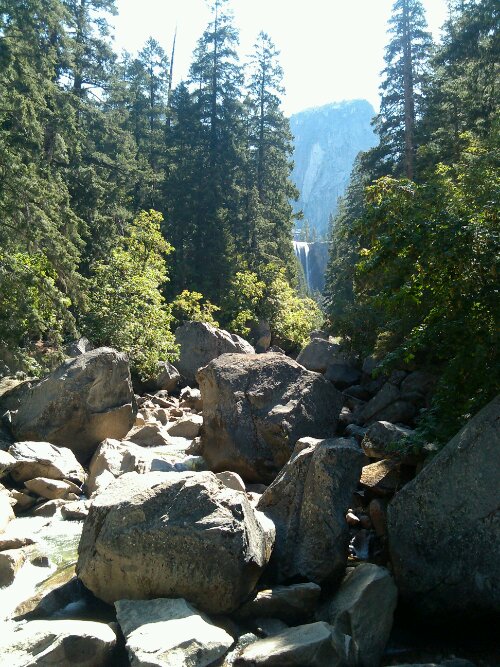 S. and E. said we could rent bikes and ride around Yosemite (I was in YOSEMITE!!! ZOMG!!!), or we could go on a hike. Ordinarily I’m all for bikes, but today I wanted the slowness of the walk so I could stare, because this place is so marvelous I just wanted to look up, wide eyes that I feared would never open wide enough to get it all in. I mean, these are the biggest granite monolith rock formations in the world–I’m not going to speed by them on a bicycle. Instead we joined many of the other 20,000 visitors at the park today on the Mist Trail straight up the hill toward Vernal Falls. As we crossed the first bridge the scene took my breath away, and then S. urged me a bit more to the right, saying, “It’s over here.” And then this view, which I couldn’t actually capture with my cell phone camera, that made my skin tremble and my eyes get weepy. Oh, John Muir, you were right. We walked almost to the top, every direction too much to handle, and then we tripped back down before getting back in the car for a long and winding drive to the coast. We got a 45 degree temperature change today, and tomorrow, the ocean. Vacation, you are ridiculous, and I approve. Now somebody lend me a bike.