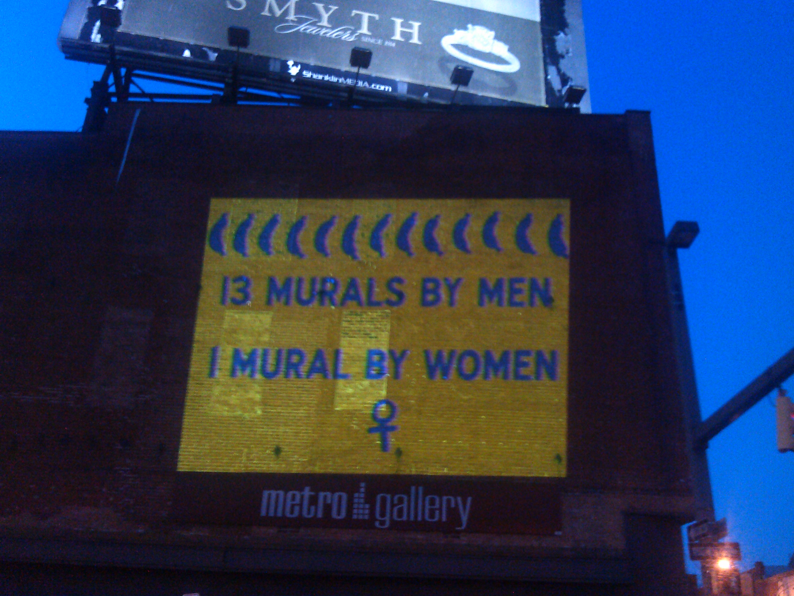 The temperatures have dropped again, spring break is over, and most of today was spent being a grading machine after yesterday was a wash–thanks, food poisoning! None of that meant I didn’t get to ride the Surly one last time before heading back to classes. I took her out for an afternoon ride around Waverly, running errands and remembering how important it is to remember gloves, and then out for a second ride, a short one down to Station North for the opening reception of the Open Walls Baltimore (OWB) project’s second year of events. OWB is a giant art project in the Station North neighborhood of Baltimore, which was designated an Arts & Entertainment district in 2002. That designation means tax benefits for redevelopment that targets artists, and tax breaks for artists who choose to live in these districts. The designation encourages new people to move into neighborhoods that are seen to be struggling due to a lack of residents, or, at least, a certain kind of resident. The arts district is great for tons of people–for artists, small business owners, and anyone who wants to see a vibrant creative scene get nourished in their city. And of course it has its problems–housing designated for artists is another kind of segregation, and isn’t that what we don’t want? And there’s the fear of gentrification–who wants to keep renting to non-artists when the real money’s in redeveloping and calling it “artist’s housing”? As the neighborhood becomes a site of value, property taxes also go up, and folks who have owned and lived in the neighborhood for a long time can find themselves priced out of their own homes. Like anything, it’s always more complicated than just saying YAY! ART! Same goes for OWB. It is a wonderful project that brings street artists from all over the world to paint ridiculously wonderful murals on some of our many, many empty walls. Who wouldn’t be excited by that? Well, there’s the part where murals and street art have become the sign of a blighted neighborhood; others argue that the project should employ some of the many Baltimore-based street artists who certainly have their own stories to tell on these walls of ours. Or maybe murals should be designed with community input–we’re the ones who move among them, after all. And then there’s the part where this year’s selection of 14 murals includes only one painted by women. One. In 2014. Wow. Now, it is certainly true that Station North Arts and Entertainment supports many women and trans artists in other ways through funding projects in the city, but OWB is what they’re known for, and that other support doesn’t change the fact that only one mural–and these things are huge and permanent–will be painted by women. The art world has a long history of just this sort of thing–check out these folks for evidence and some good history of this persistent problem. Tonight’s bike ride took me to the artistic intervention by the collective Greenpants. They projected their short video on the wall of the building that held the OWB reception, and it was howlingly good–funny, on point, and drawing attention to a thing we’re not supposed to notice–that yes, it’s all men, again. I watched a few rounds, chatted with the crowd, and then got back on my bike and headed up the hill to home, glad to live in a city that has such art, and such critical artists, and is willing to have these conversations. Now if they could just turn the heat on.