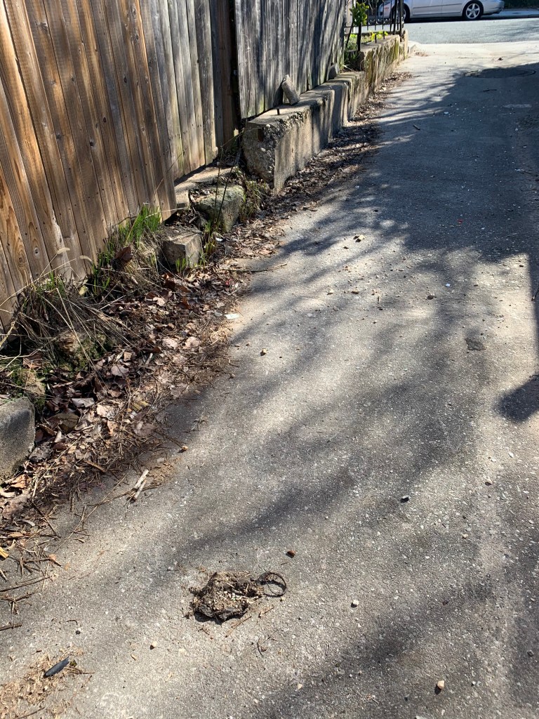 For the past many weeks, I can’t even tell you how long, I’ve been walking my bike past this dead rat. It’s the glob at the bottom of the picture, and if you didn’t know it was a rat, you might think it’s just a wad of trash.
