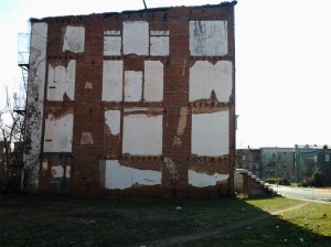 We had another unseasonably warm day today, at least in my estimation, so after a busy morning, I hopped on my bike and headed to campus to take advantage of what they keep telling me is one of the last few warm days before winter really gets here. I flew down the hill and then made the Park Avenue climb to Lafayette and took my left. It’s amazing how quickly the neighborhoods change along this street. Once you cross Eutaw Place, for example, it’s like you’ve entered a different universe. On the ride back I was struck by how once I left Marble Hill for Bolton Hill, the asphalt turned that smooth black of brand new road. When Crossing Pennsylvania Avenue into West Baltimore is even more pronounced. All of a sudden the trees disappear, as does the stately red brick, replaced by row after row of abandoned row house. I snapped this picture of a row house at Lafayette and Fremont (which is not the same as Fulton–I made that mistake once, and it took me a looong time to correct it). This empty side suggests another row house used to be cuddled up next to it, those patches maybe marking windows, or just the shared walls. Off in the distance more and more of these vacants line up, but some of them are redone and occupied. How hard it must be to share the neighborhood with these, and the empty lots filled with crumbled buildings and trash that dot the neighborhood. So often when I’m riding around Baltimore I wonder, where did everybody go? I know, I know, the suburbs, but where did everybody go, and what are we going to do with all these empty and decaying blighted properties? I continued my ride, and when I got to Arbutus, just a couple miles further, I was reminded again of how many different cities are all butted up against each other in this place, some of them just ghosts.