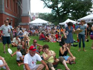 After two whole days off the bicycle–a shockingly rare event in my life in the past three years–I was a little nervous getting back on today. What if I don’t like it anymore? Yeah, that’s what my obsessions look like these days. Anyway, I needn’t have worried; it felt so good to just pedal and pedal and pedal. I headed Uptown to see J. and her sangria, and I spent most of the ride thinking about road conditions and the stickers I want to design that will say, “Don’t park in my bike lane; it’s all I have.” I spent a lovely couple of hours and was back on my bike to meet R. and family for dinner. After an ice cream pit stop, I took the bike, and headed to M.’s for poker night. I took Willow, marvelling at how terrible the asphalt was. I mean, this is paved road in only the most technical of senses. After losing my chips and my patience, I got back on the bike and rode as fast as I could back downtown to lay eyeballs on S. I took only smooth roads on this ride, pushing a hard gear so it felt like flying, until I got to the Quarter, when it was time to put eyes on the road surface. A brief stop here and there and then I was locking up the bike for dancing. I snapped this picture after taking a break to watch other people move their feet. I could say a lot about this place, but mostly tonight I thought about the world that’s going on as we move across surfaces. Takea minute, look down. And then all of a sudden it was time to go home, an easy roll back to the apartment. Yeah, I really needed a bike ride.
