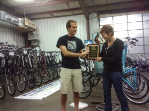 Jennifer Ruley Accepting the “Bike Easy” Award at Bicycle World