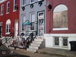 We had another unseasonably warm day today, at least in my estimation, so after a busy morning, I hopped on my bike and headed to campus to take advantage of what they keep telling me is one of the last few warm days before winter really gets here. I flew down the hill and then made the Park Avenue climb to Lafayette and took my left. It’s amazing how quickly the neighborhoods change along this street. Once you cross Eutaw Place, for example, it’s like you’ve entered a different universe. On the ride back I was struck by how once I left Marble Hill for Bolton Hill, the asphalt turned that smooth black of brand new road. When Crossing Pennsylvania Avenue into West Baltimore is even more pronounced. All of a sudden the trees disappear, as does the stately red brick, replaced by row after row of abandoned row house. I snapped this picture of a row house at Lafayette and Fremont (which is not the same as Fulton–I made that mistake once, and it took me a looong time to correct it). This empty side suggests another row house used to be cuddled up next to it, those patches maybe marking windows, or just the shared walls. Off in the distance more and more of these vacants line up, but some of them are redone and occupied. How hard it must be to share the neighborhood with these, and the empty lots filled with crumbled buildings and trash that dot the neighborhood. So often when I’m riding around Baltimore I wonder, where did everybody go? I know, I know, the suburbs, but where did everybody go, and what are we going to do with all these empty and decaying blighted properties? I continued my ride, and when I got to Arbutus, just a couple miles further, I was reminded again of how many different cities are all butted up against each other in this place, some of them just ghosts.