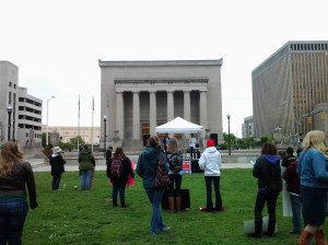 I was getting ready to ride my bike down to War Memorial Plaza to join Friday’s protest when my neighbor J. texted me. “You’re not going to the protest, are you?” Actually I was, and though I tend to travel solo, I was happy to have company for the ride downtown. I met him on my bike just up from the alley, and he stayed at least six feet behind me as we rolled down the hill.
